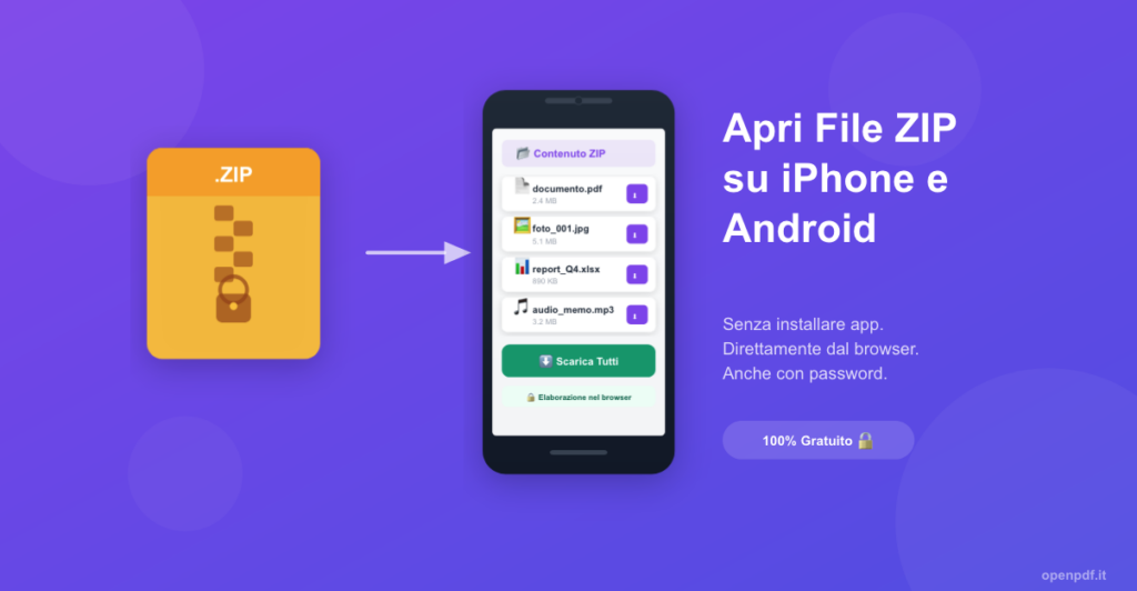 Aprire un file ZIP su iPhone o Android non deve essere complicato. Con OpenPDF puoi farlo in pochi secondi dal browser, senza installare app, senza registrarti e con il pieno supporto per archivi protetti da password. Provalo la prossima volta che ricevi un file ZIP sullo smartphone.